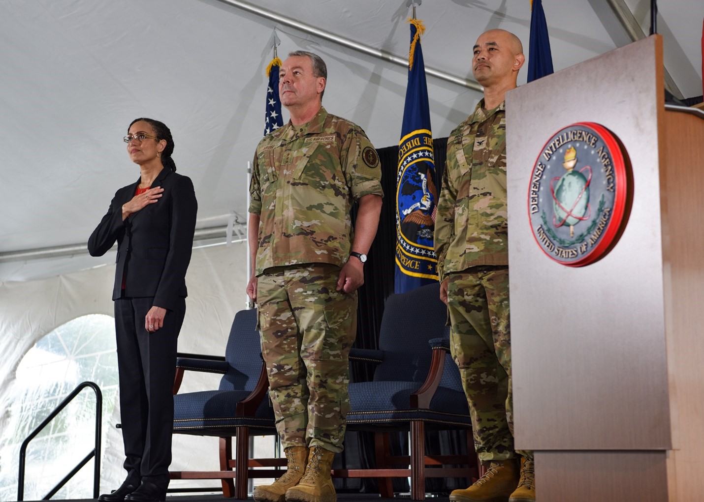 Principal Deputy Director of National Intelligence Dr. Stacey Dixon, DIA Director Lt. Gen. Jeff Kruse and USACE Baltimore District Commander Col. Frank Pera stand at attention during the National Anthem.